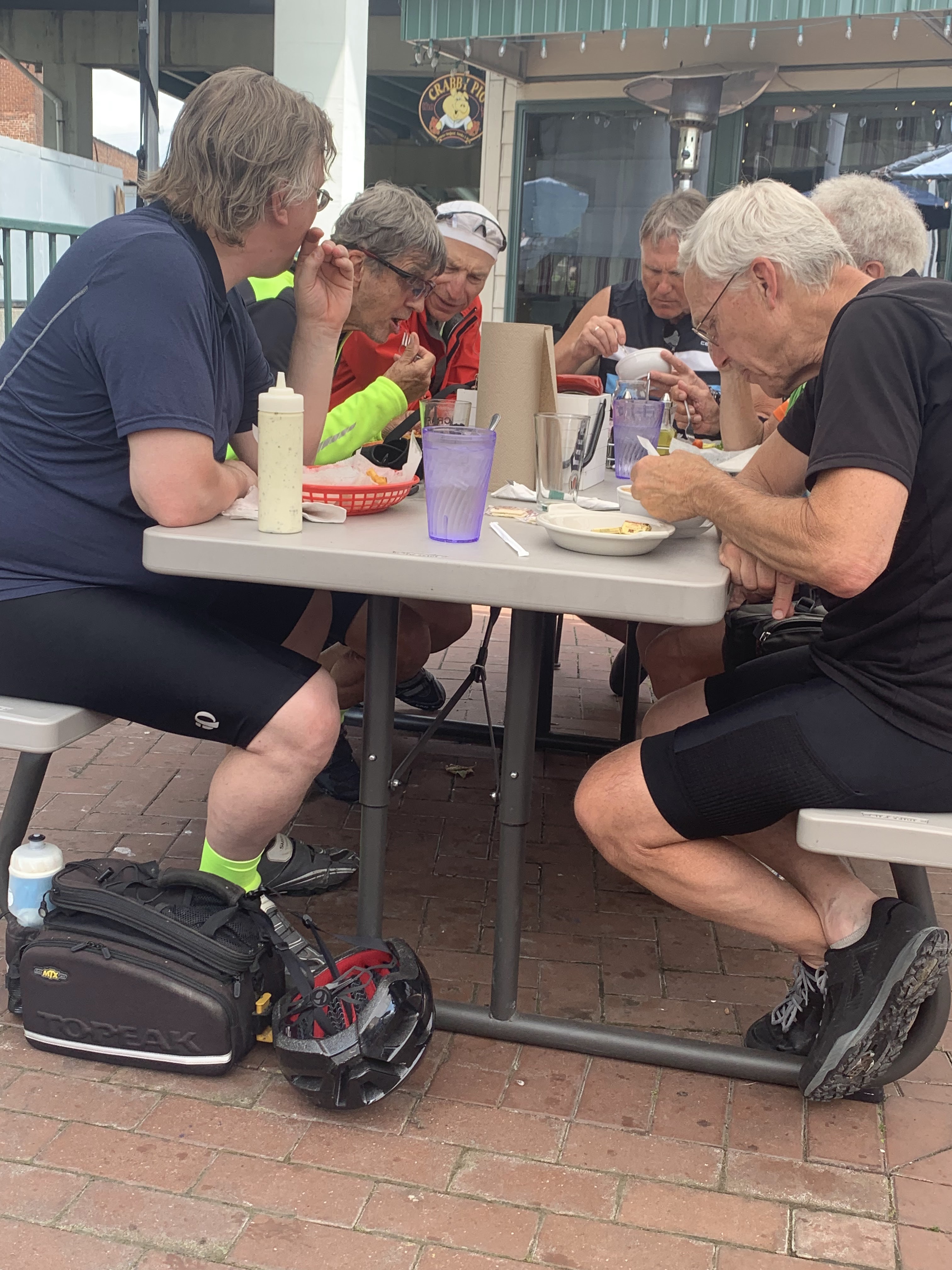 We rode 44 miles on the C&O Canal, I also hiked a 1 1/2 mile trail detour because the PawPaw tunnel is closed for some reconstruction, and I had about a 40 mile ride in the van so that I didn’t have to do a wicked 6 mile climb to the very nice BnB where we are staying. Most of the group didn’t want to do the detour hike, as pushing a heavy ebike up a narrow trail would be a challenge and taking it down the other side even more difficult. Consequently, Ken was shuttling riders and bikes in two trips, so when he picked me up 6 miles from the hotel, I had a round trip ride back to the lunch spot. Crazy day, and lots of driving for Ken.
